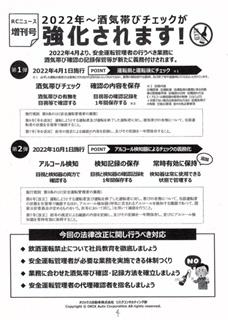 今日はいつも大変お世話になっている元請けさんの安全衛生協議会で酒気帯びチェックが今年の4月から強化されるとの事で、安全運転管理者の業務に酒気帯びチェックの記録保管が義務付けされる様になったと情報を頂きました!